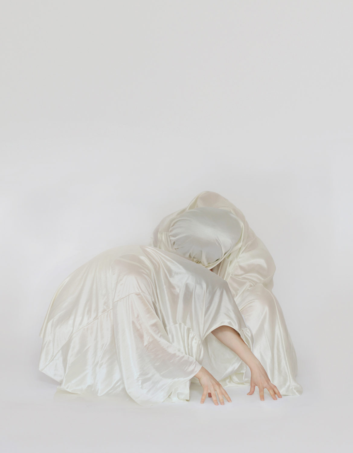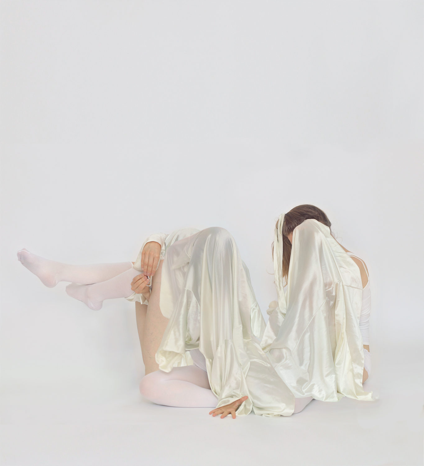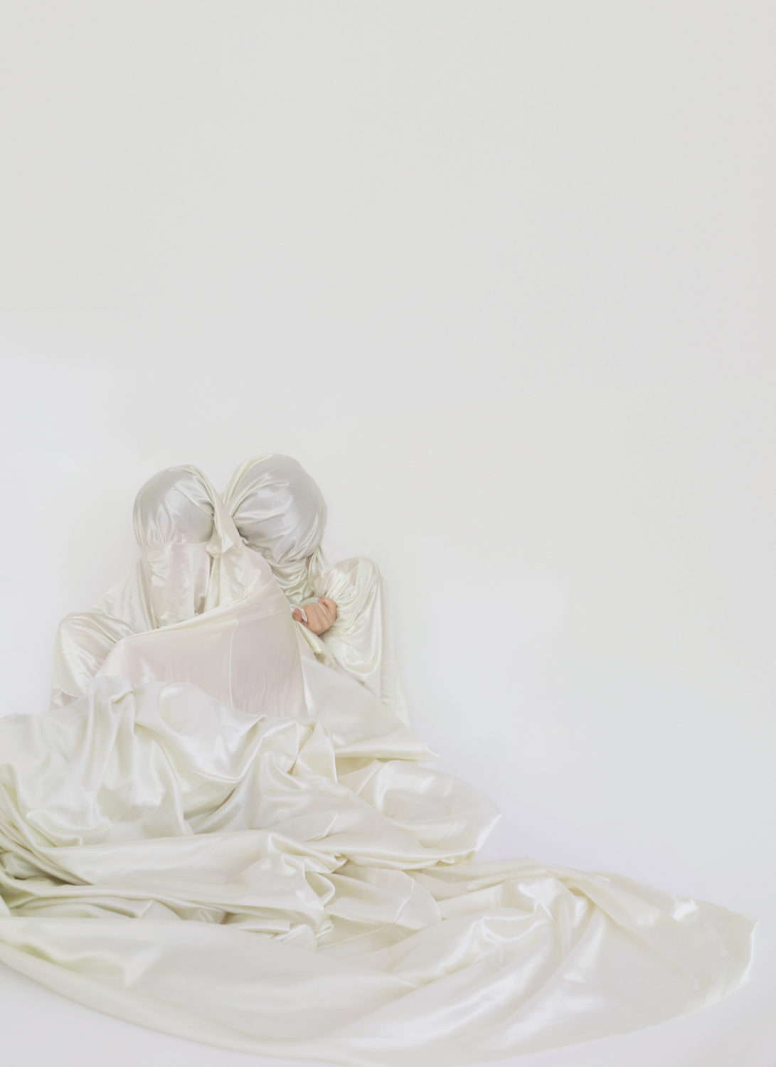 Covered in white satin bodies form into figures. Their physicality reveals itself through the force of gravity to which the figures appear to be subject. Shadows, touches and directions of flow describe positions. In the image montage, several views are interwoven into one. Clear, recognizable figures dissolve in their duplication. The figures do not show any faces. Identification thereby remains denied. Where does identity begin and where does it end? Which gestures reveal a movement or shape to be human? The withheld look onto a face draws the focus onto something else. The hands become protagonists of the emerging figures. They operate the self-timer, they create the photograph. They ban the figures they entail. Hands too are witnesses of identity: It can be attested and insured via the narrow lines of the fingertips be it in crime or on smartphones. The hands hold a threshold function between the physical and the digital world. They translate the satin covered figures into a photograph triggering the shutter release. The resulting image visualizes this process. In the form of a photograph, the figure crosses the threshold from the physical world into the digital. The hands become the symbol of this transformation. Not only over the shutter release, but also on screens and displays they let two worlds touch. On the surfaces of screens dimensions merge and collide at their tips.