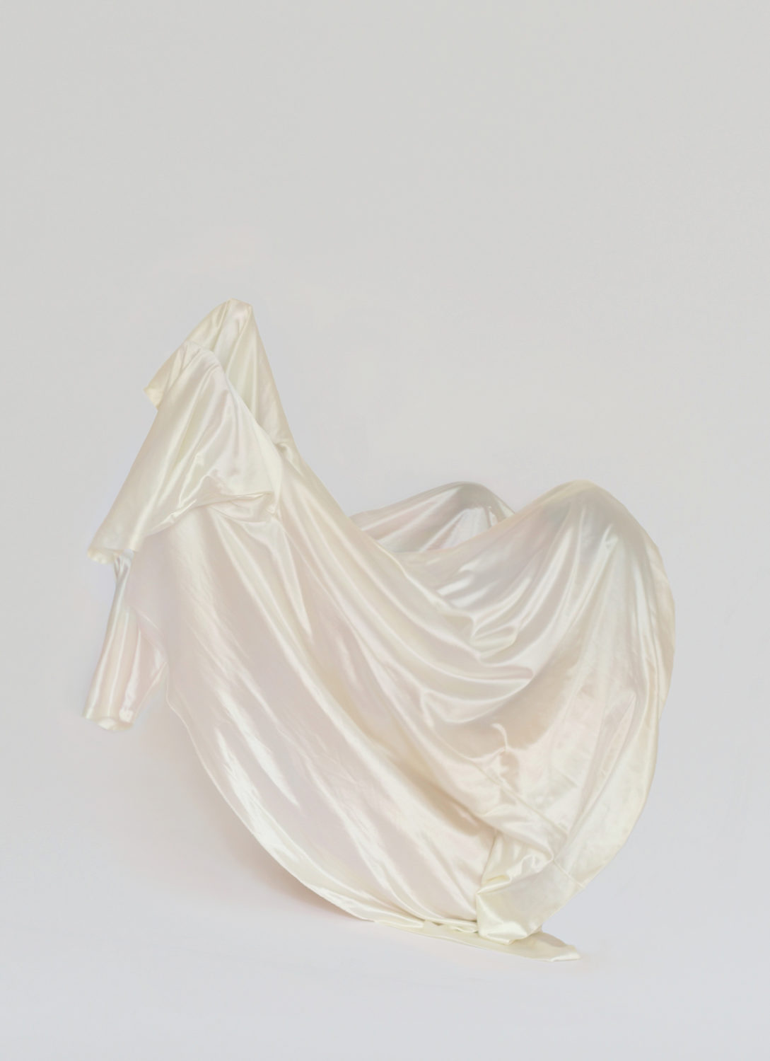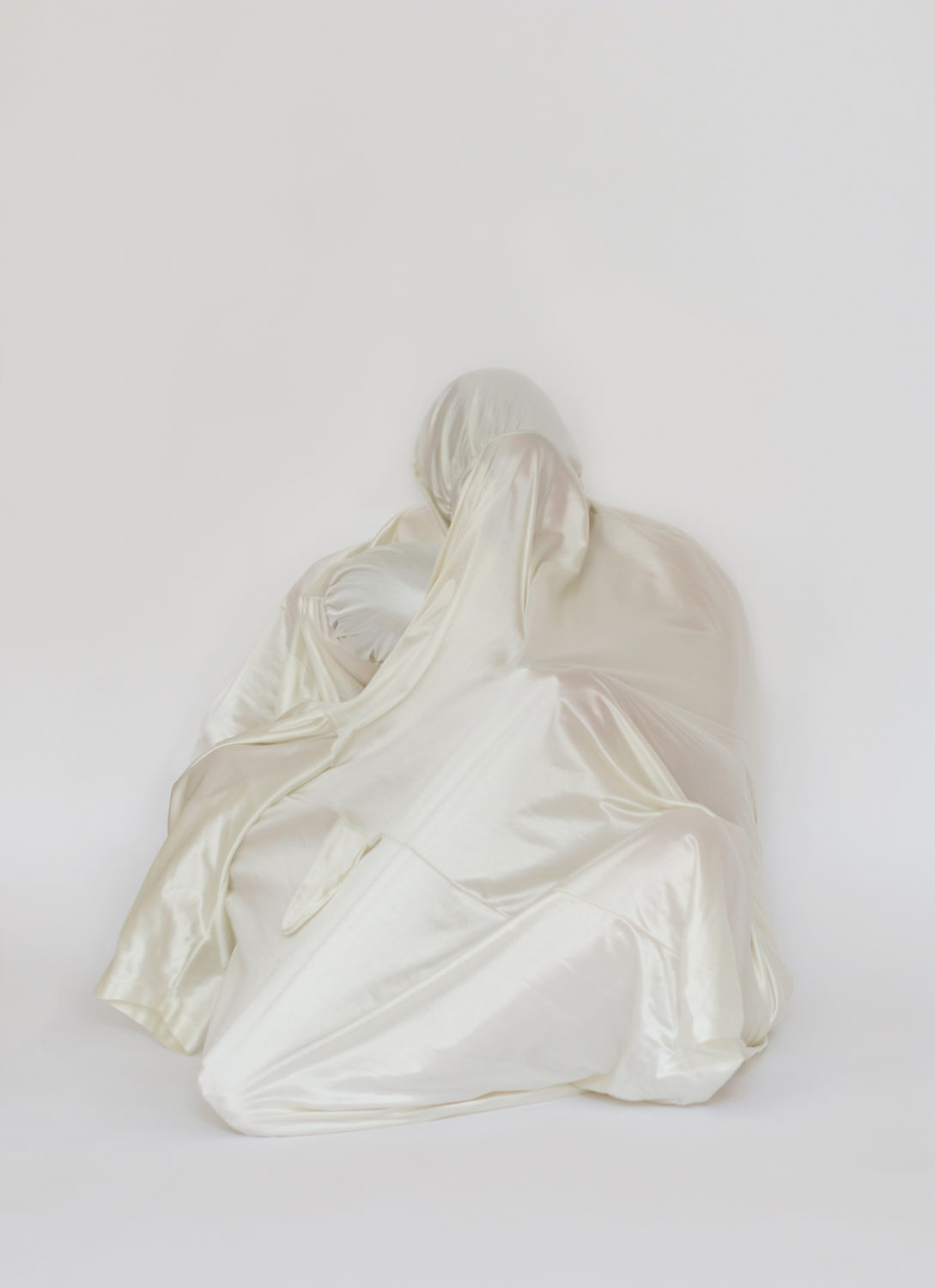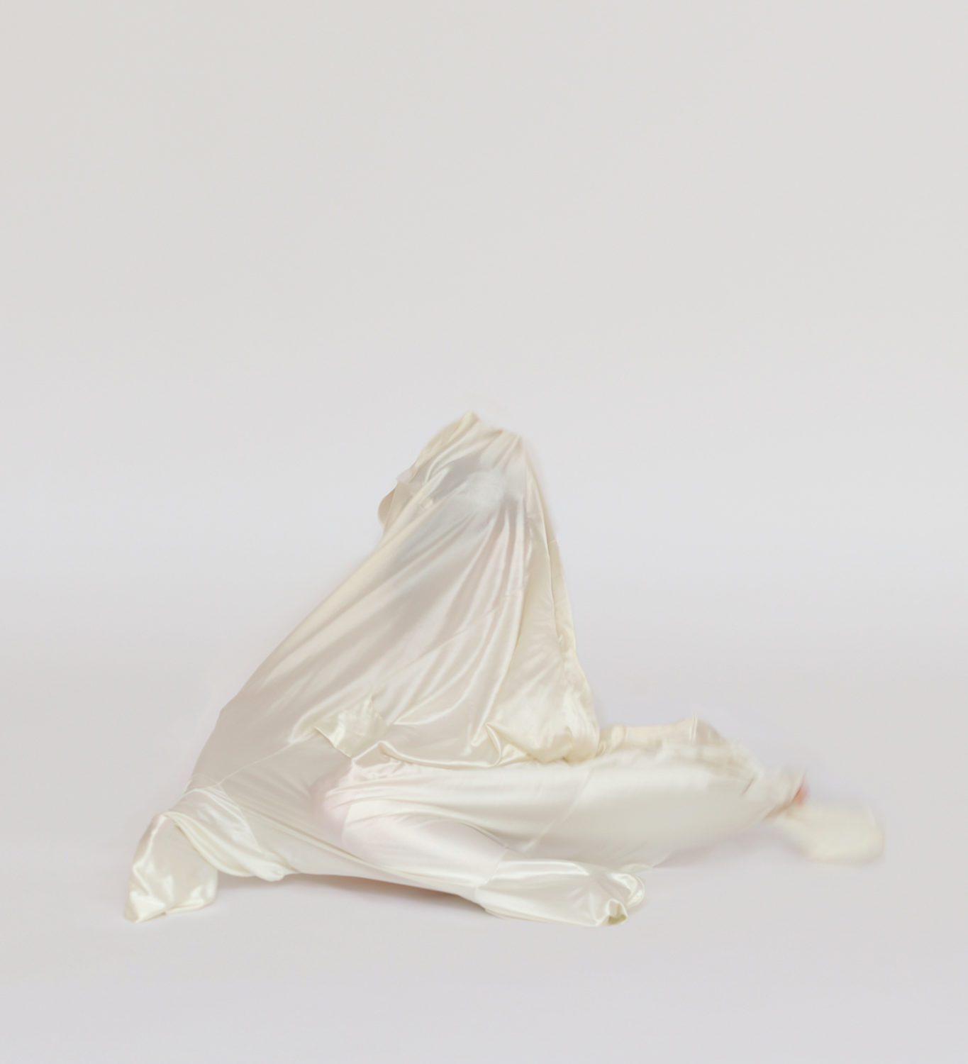 Covered in white satin bodies form into figures. Their physicality reveals itself through the force of gravity to which the figures appear to be subject. Shadows, touches and directions of flow describe positions. In the image montage, several views are interwoven into one. Clear, recognizable figures dissolve in their duplication. The figures do not show any faces. Identification thereby remains denied. Where does identity begin and where does it end? Which gestures reveal a movement or shape to be human? The withheld look onto a face draws the focus onto something else. The hands become protagonists of the emerging figures. They operate the self-timer, they create the photograph. They ban the figures they entail. Hands too are witnesses of identity: It can be attested and insured via the narrow lines of the fingertips be it in crime or on smartphones. The hands hold a threshold function between the physical and the digital world. They translate the satin covered figures into a photograph triggering the shutter release. The resulting image visualizes this process. In the form of a photograph, the figure crosses the threshold from the physical world into the digital. The hands become the symbol of this transformation. Not only over the shutter release, but also on screens and displays they let two worlds touch. On the surfaces of screens dimensions merge and collide at their tips.