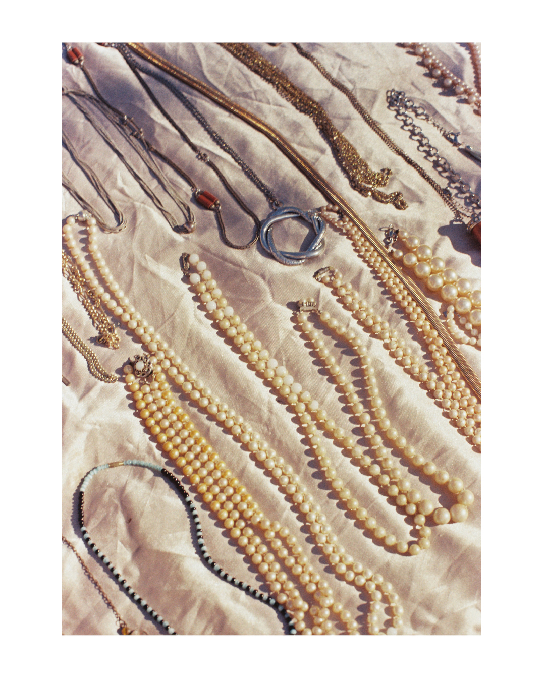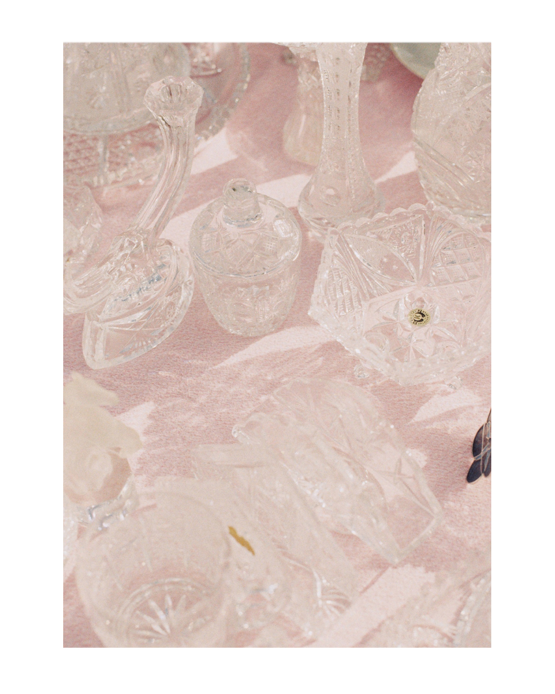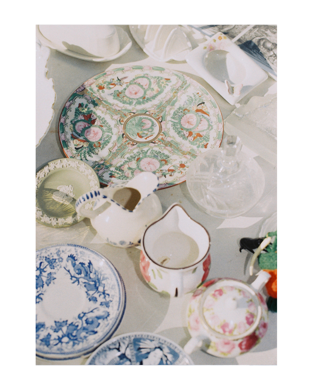 Here stands a collection of materials: crystal, glass, pearls, chinaware, porcelain, satin, velvet, etc. The combination of shapes, color and surfaces embellish the scenery, their previous worth and value however has diminished, they are old glory-time snippets of domestic human living and examples of the material and design that we surround ourselves with.