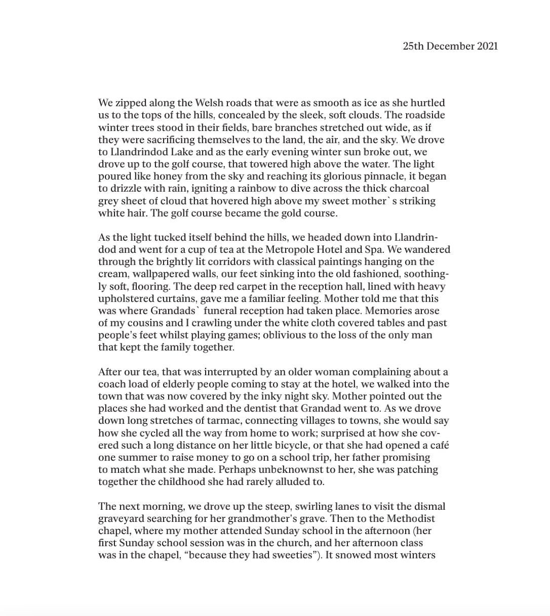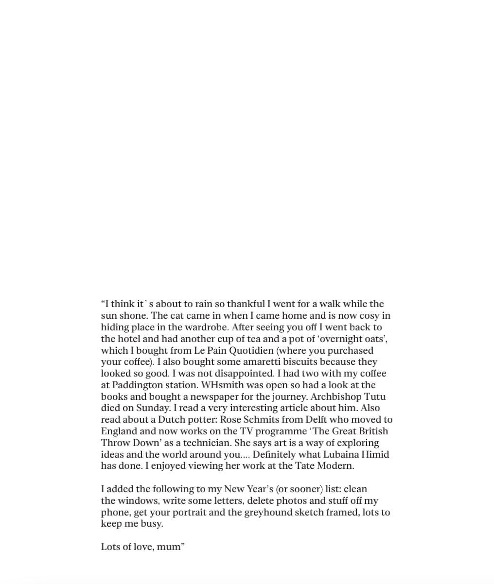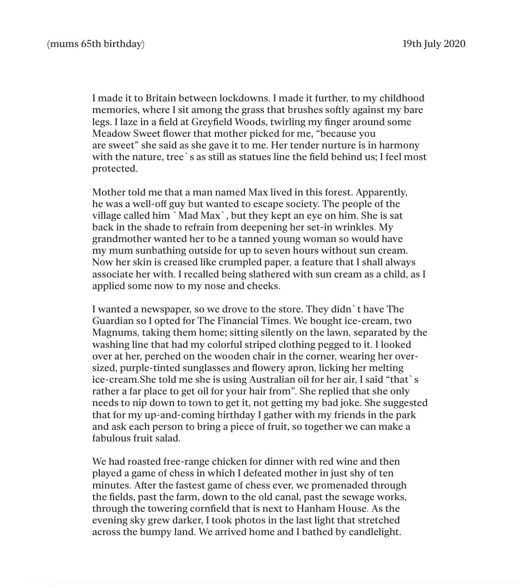 Then came a third element – quotations from email exchanges between my mother and I, which was reduced to removing my response and keeping only her writing. These snippets are rather comical, revealing the reality of the banality of her retired routine. Therefore, they interjected the images – and it was debated whether or not to include them, since the quotes demonstrated a starkly different character of the women that I was visually portraying. I decided to keep the writing in the midst of the images because this project, although directed by myself, was a collaboration and it felt right to have my mother’s innocent character to contrast the strict and stern woman that I project her as.
