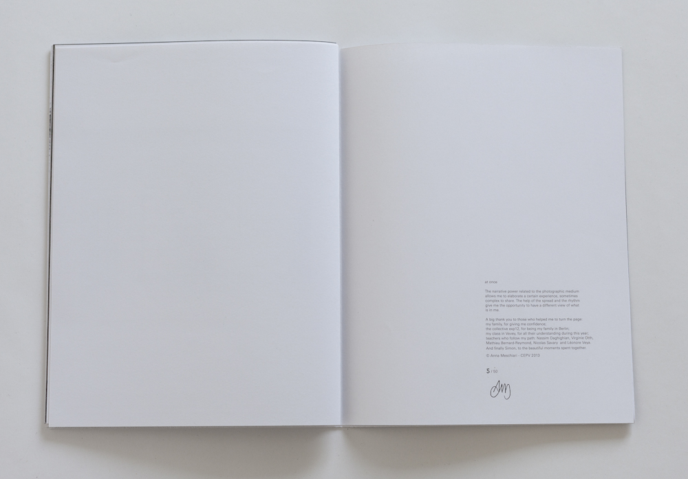 [vimeo video_id="71808738" width="1000" height="563"] The series "At Once" has been conceived as an artist's book in a edition of 50. The book is presented unbounded and the cover, when opened, creates a poster of the double dimension of the publication. The picture on the inside of the cover reveals a character you cannot really classify: maybe a teenager, a girl, a boy. Conceiving the book during about six months could give me some distance to the images that I've made during one year. The result is a collage of pictures that are part of my archive. The way the photographs have a place in the book, reveals the necessity to narrate within the structure of it. The book is to me a way of thinking, a medium that helps me to cope the reality and give a response to it. The book allows the work to be seen from many people around the world. "At Once" had the chance to be presented at the Tokyo Art Book Fair 2013, Bergen Art Book Fair 2013, Vienna Photobook Festival 2014, Zines of the Zone mobile library, is part of a few collections and is making a big trip around the world in the Box of Dummies.
