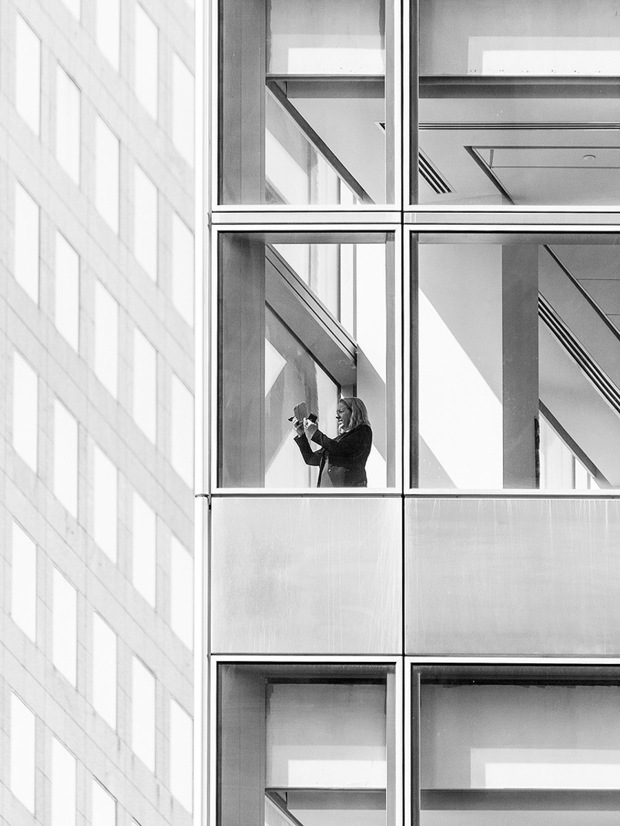 When people appear in the images they are dwarfed by the vastness of the urban landscape. There is something actively dehumanizing about the scale shifts that occur between the figures and structures. In some of the more unsettling images there’s a palpable sense of voyeurism, as if the people pictured exist within an urban art farm, of sorts. They are observed in their “natural environment”, but are blissfully unaware that they are being watched. The people in these photographs are not individuals so much as symbolic markers of the dislocation of our technological urban centers.