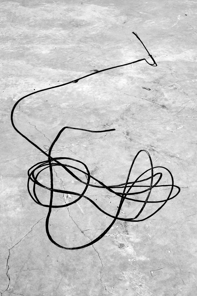 Voïta’s work challenges the viewer with a similar kind of spatial language. While Dibbets’ forms often present themselves simply and appear to project themselves out of their environment, Voïta’s sculptural installations are more chaotic, optical and destabilizing. Circular white objects are situated precisely in a largely black space to create a flattened diagonal pattern. Other times connected black hoses snake around a white room and take the poetic form of an associative line drawing.