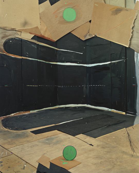 I paint, or attach, materials on the walls and floors and let forms materialize in that way. In fact, they are almost empty decors. At first, I wanted this work to refer to photography with its flat, rectangular shape and its different formats and negatives. After working for a while, more ‘action came on stage’, which created space for other forms to evolve as well.