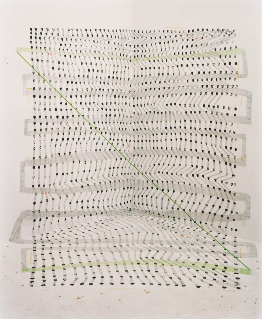 I happened upon the photographs of Swiss-born artist Bernard Voïta a few years ago and was immediately drawn to their spatial complexity, play with illusion and sense of disorientation. The work exists in the lineage of Jan Dibbets’ series Perspective Corrections, where three-dimensional forms drawn in string, pencil and tape, and situated on walls, floors and lawns, are rendered flat and two-dimensional through the implementation a precise photographic vantage point. The work is a conceptual meditation on the disparity between perception and representation – between what the eye sees and what the camera sees.