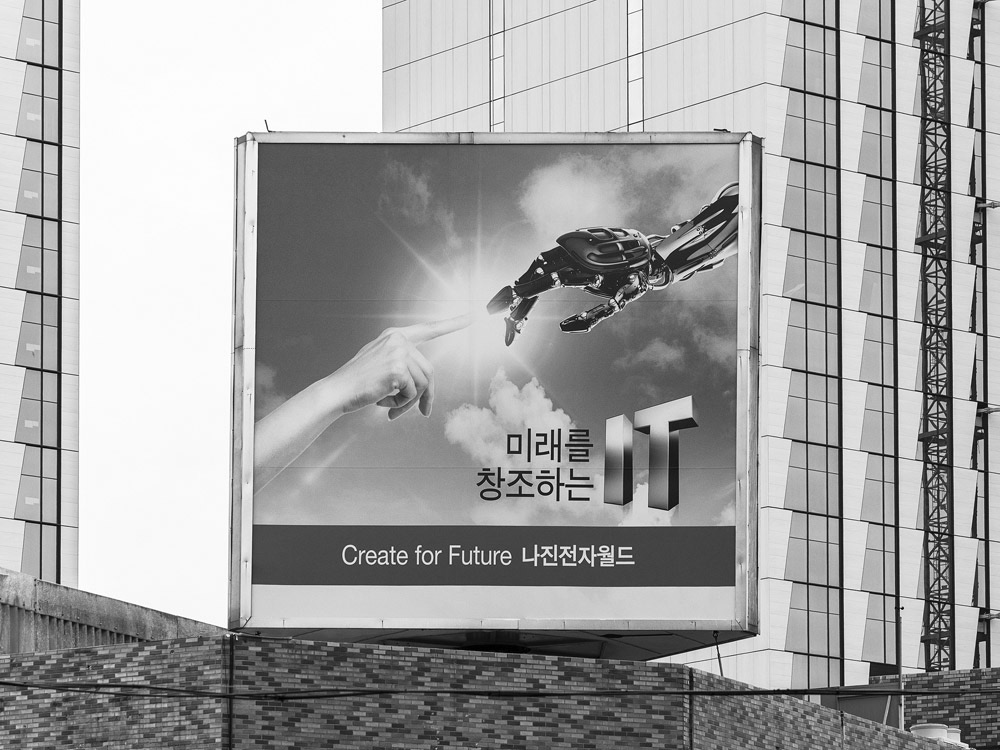 Mårten Lange‘s The Mechanism, recently published by MACK, is an allegory of contemporary life in the urban environment. Often claustrophobic and isolating, the images that comprise this body of work depict the modern city as an oppressively homogeneous space. The edifices in these pictures are nearly indistinguishable from another, bound together by a combination of anonymity and geometric severity. It’s not at all apparent whether these photographs were made in a singular city or a constellation of them. And that feels like the point. With the exception of a few subtle markers – one billboard depicts a robotic finger touching a human one with Japanese writing on it – there is very little geographic specificity. This is ‘anyplace’, or more aptly ‘no-place’. It is an archetypal representation of a commercial city in an age of standardization and uniformity.