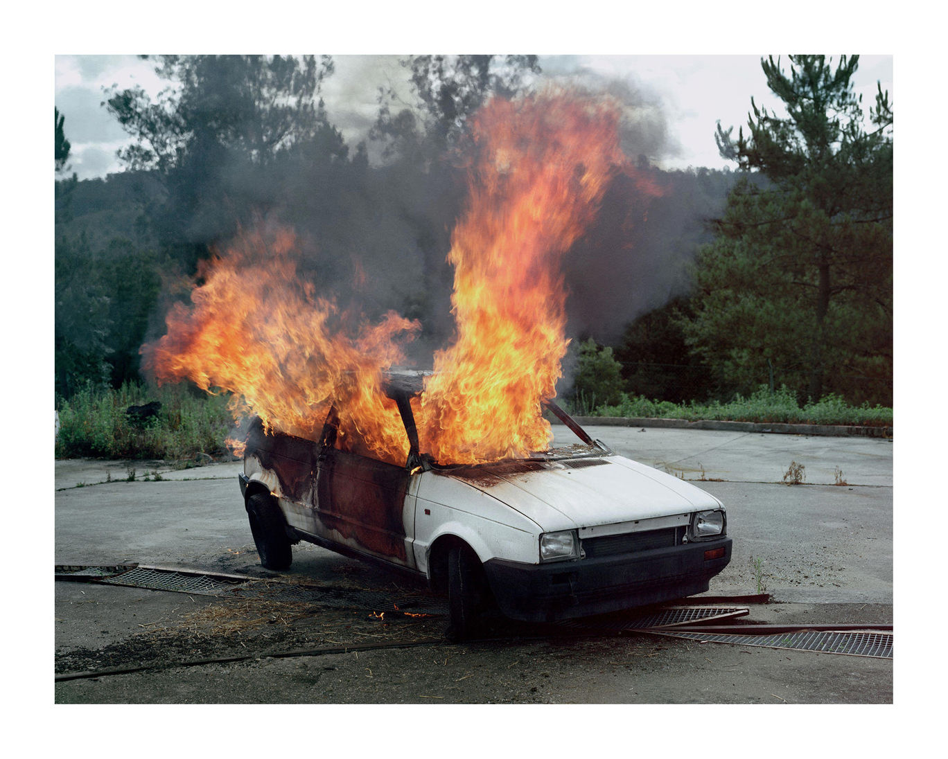 To produce this image I was faced with the challenge of capturing it on a large format camera which is a camera I often use within my practise. The problems being on one hand the slow shutter of this camera, for which I had to do some maths relating the speed of the object with the distance from camera and the speed that it would move on the negative. The second and main problem was the slow operation of the large format camera, it impossible to take more than one shot with this camera for an action that lasts two seconds as I wouldn’t have been able to load another negative in such a short space of time. I therefore made the decision to set up two cameras with an assistant operating the second one.