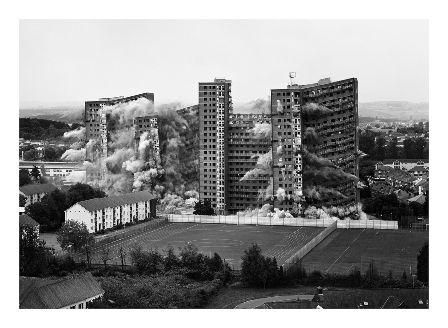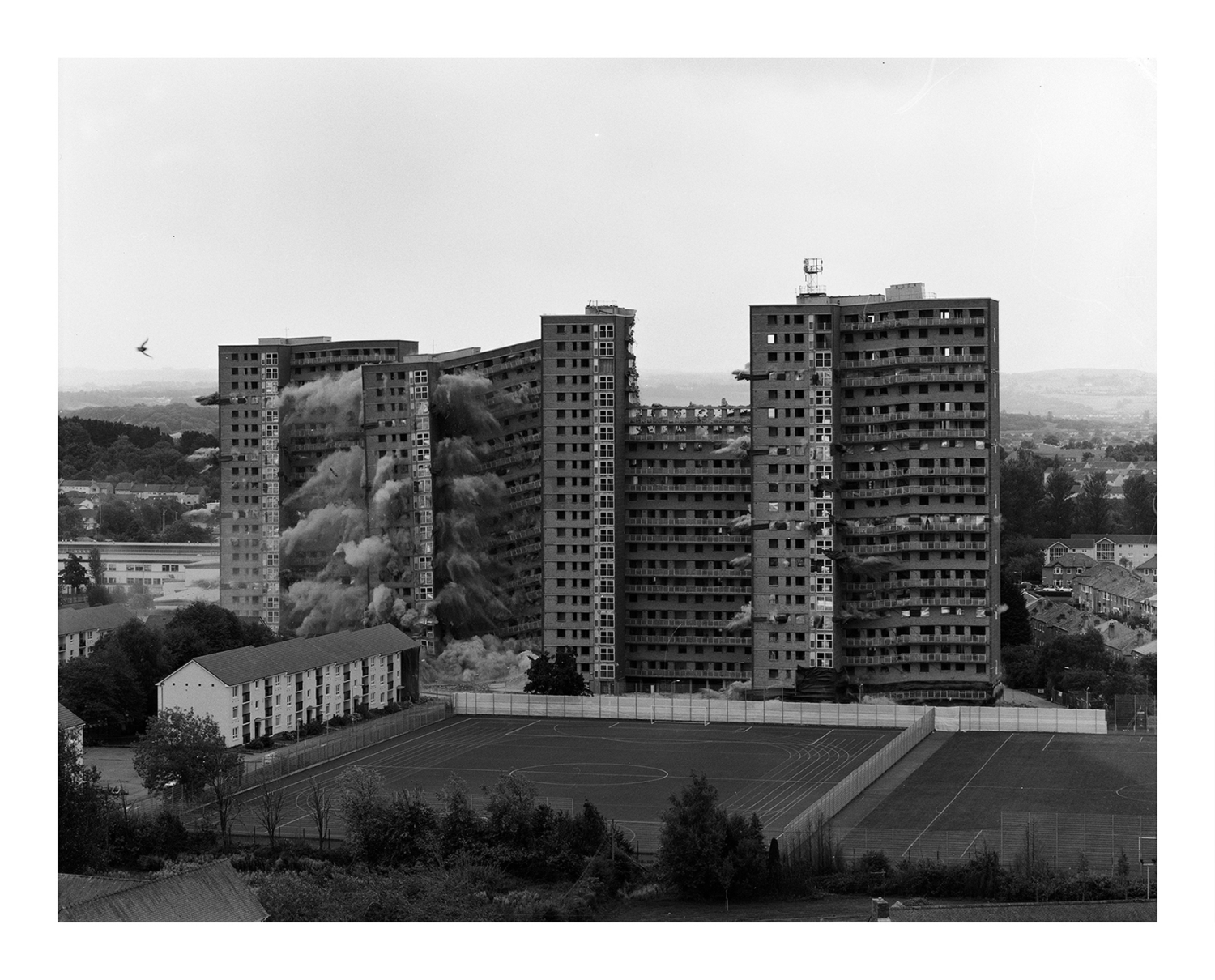 After a year of researching and obtaining a number of different permissions, I traveled to Glasgow in September 2015 to photograph one of the many buildings that were being demolished in the city. The Tarfside Oval complex, a group of four residential towers consisting of 22 floors each, located in Mosspark, a neighborhood in the South of the city.