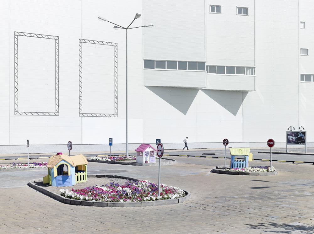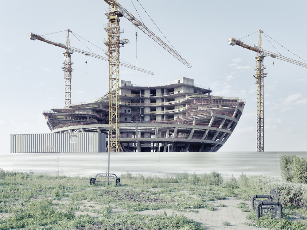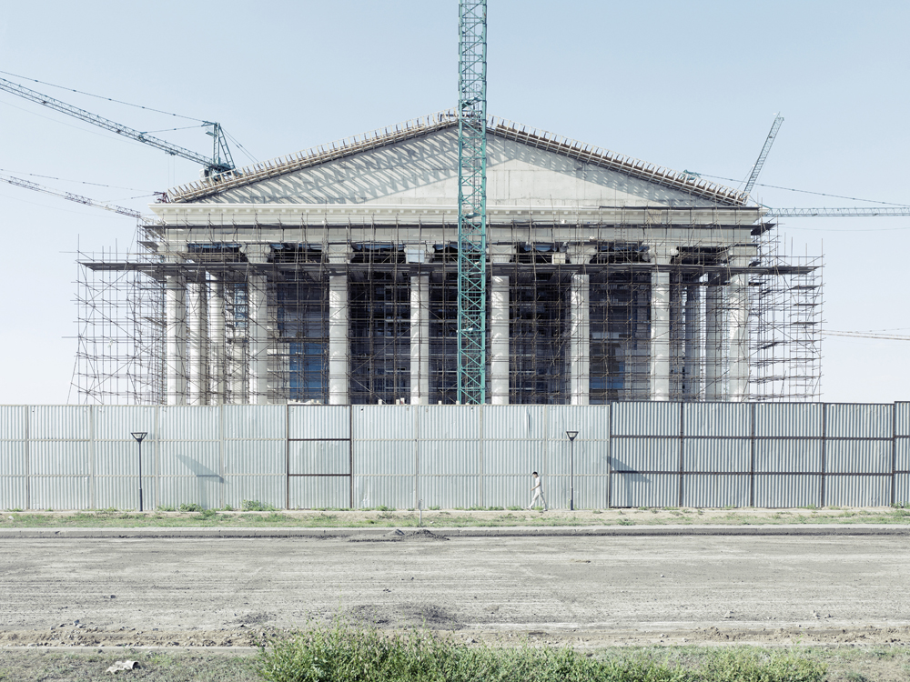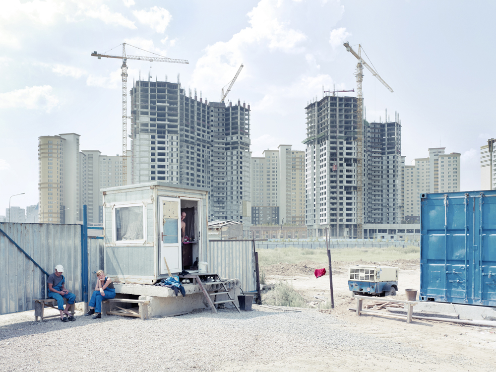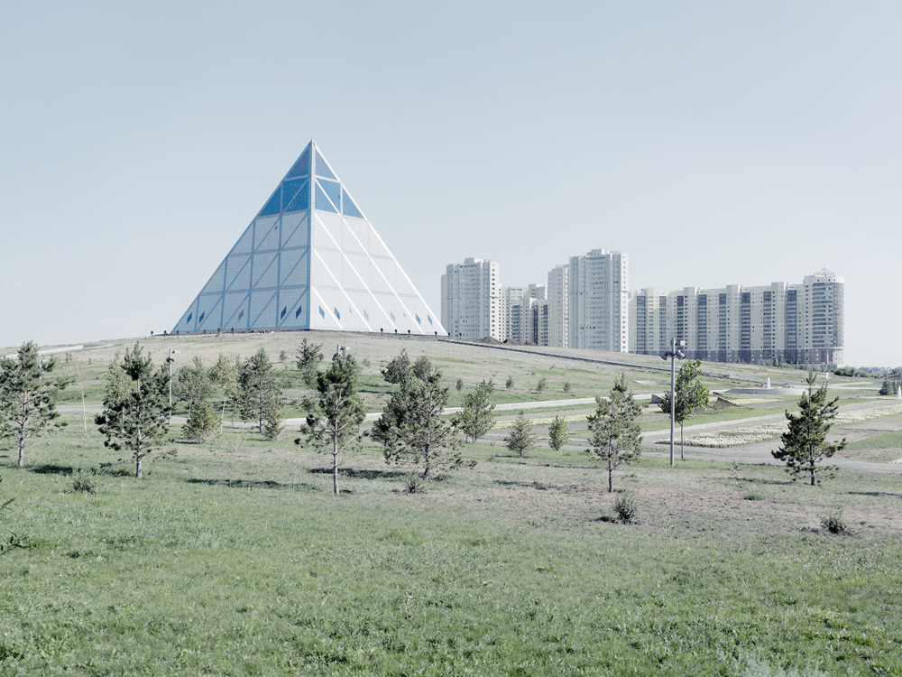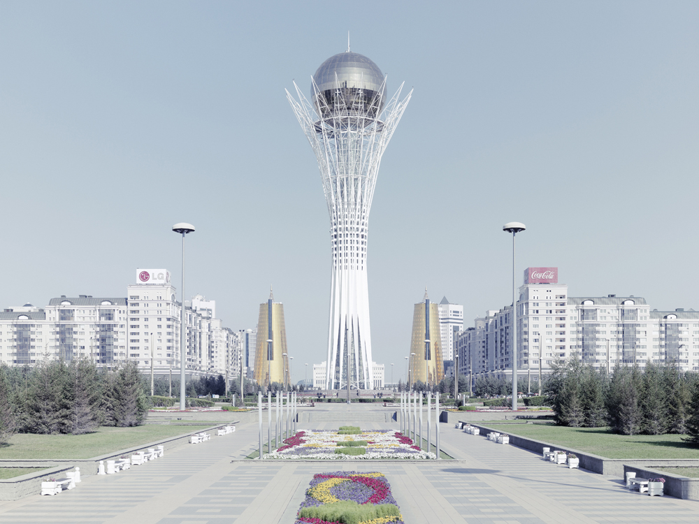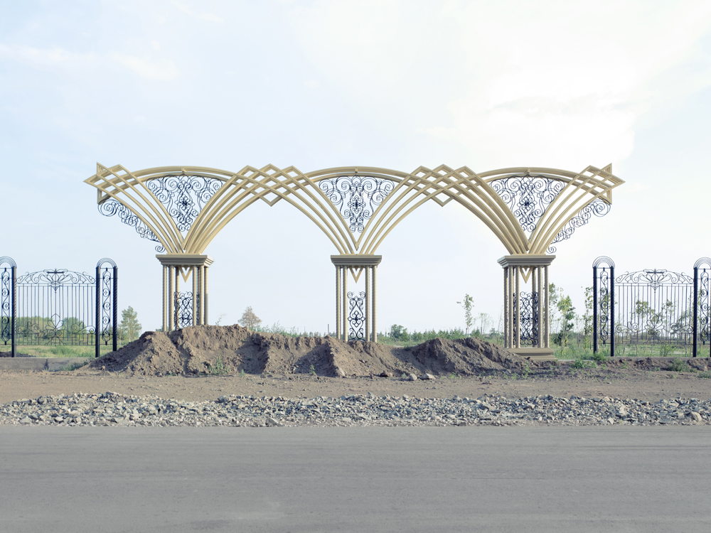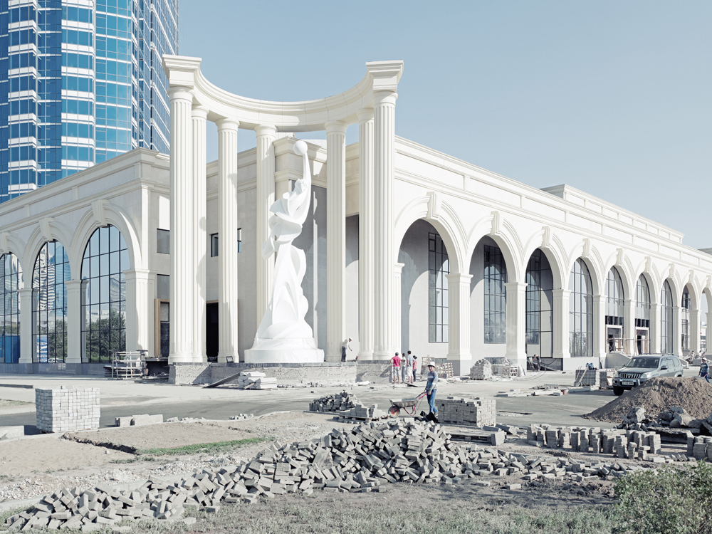 Moving a capital city is an important decision. In 1998, Kazakhstan unveiled its new capital and Almaty lost its status to Astana, located 1300 kilometers up north. As the world’s most recent capital city after Pyinmana (Myanmar), Astana is also the symbol of a new start, a unique initiative in the Post-Soviet region. This colossal project, the challenge to nature that is the construction of a capital city in an extreme climate which requires the laying of specific foundations, shows the will to break up with the past, to implement historic reforms and to encourage an appropriation of identity. Considerable means have been deployed so that Astana could assume its role as the country’s new showcase city, while promoting the country’s development and insertion into the global economy. If architecture generally bears the signs of a particular culture, the face of the new capital city is also one of power and, on a symbolic level, of a new political orientation. The new official buildings are sometimes colossal, bordering on disproportion, the skeletons of ill-assorted buildings rise from this suburban-like area, which vacillates between authenticity and artifice, between materiality and imagination tinged with utopia. As an immense construction site, where embassies and upscale residences rise next to vast buildings meant to house all state organs, Astana seems impossible to finish and struggles to maintain all its empty spaces in a good state. Although grass is growing and casually occupying all interstices, the official discourse has to remain enthusiastic and seductive. Aiming at a brighter future for migrants, these buildings showcase the state as a viable sociability frame. An ensemble of ornamental elements, where the rare dramatized vegetation gets by while seeming to admit it is insufficiently implanted.