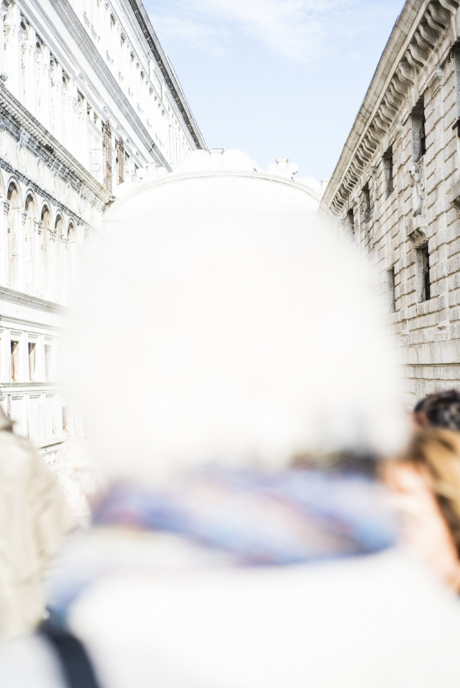 Cristiano’s colour work also relates to the venetian pictorial technique of “tonalismo”, which meant depth was achieved by means of the use of colour. In “Marmo”, the use of flash and of a limited colour palette points to a different end: illusionistic space is constantly challenged by overexposed areas and awkward angles, the marble curtain of representation is thus magically thrust aside to reveal the open eyes and mouth of Medusa, and beyond them the whiteness of blank pixels. Cristiano’s Venice is also an empty city (the Latin word “vanus”, after all, means empty).