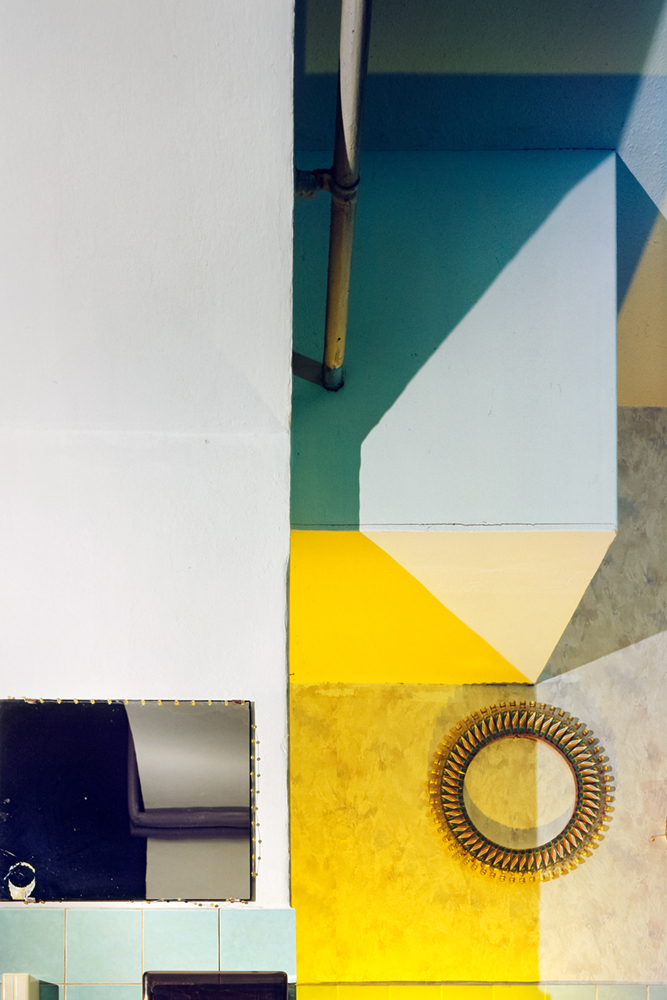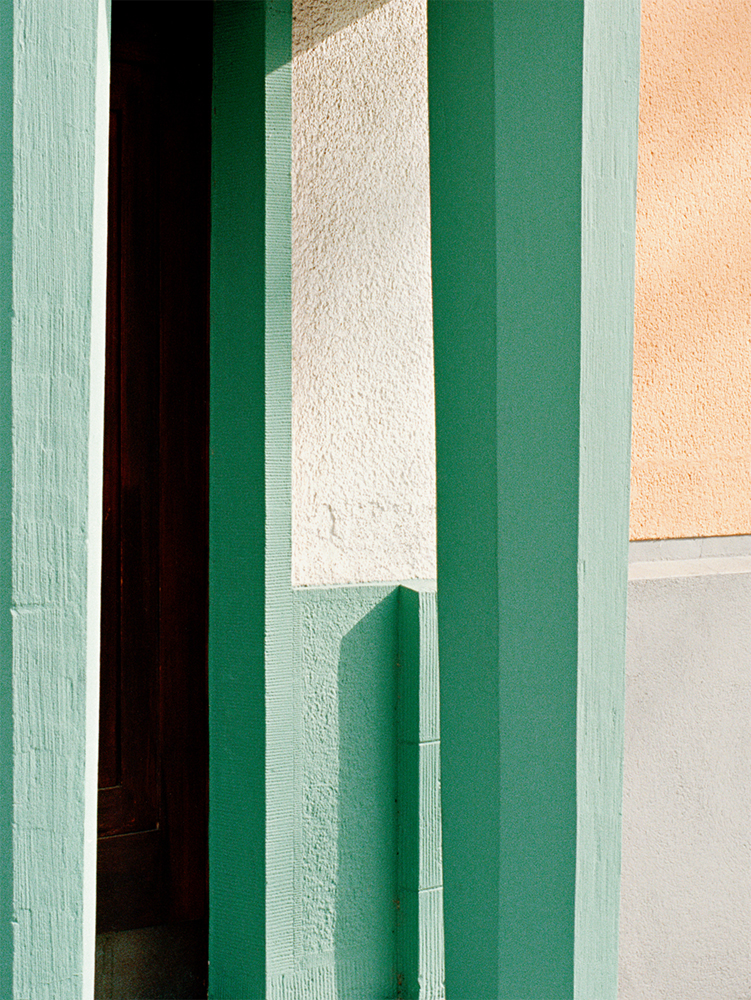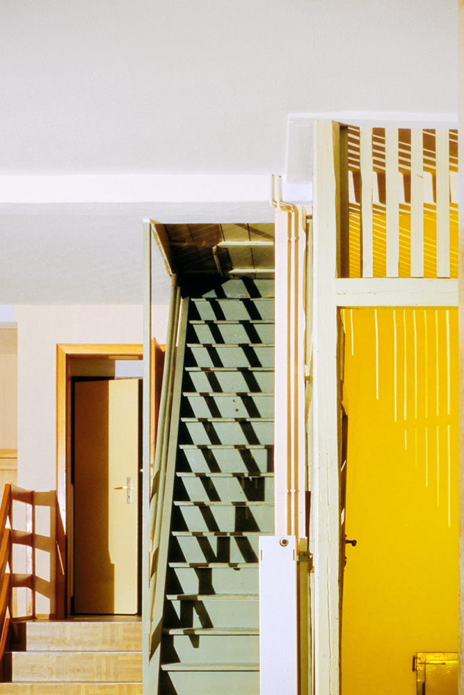 Space is turned inside out by an extremely technical use of photography. Artificial lighting in “Erbgericht” and the clever framing of modernist architecture in “Das Eck” are used to create colour fields reminiscent of concrete art, but that here are serving a different, and less analytic, purpose: that of unlocking the private space of memory. There is no math, no lyricism, no symbolism to be seen in Andrea’s pictures. There is instead something playful, although never childish, in the places she invents. Most importantly, although the images are apparently flat, there is always some depth, there is always enough shadow: that of a door half opened, that of the dark blue area beyond wooden banisters, that coming out of an attic and projecting itself down on a flight of stairs. And as we know from Bachelard, but also from Tanizaki, dark corners and niches are inhabited by reveries and sacred things.