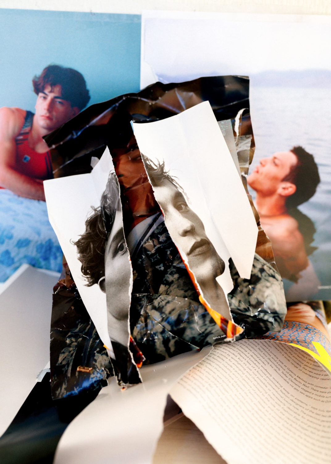 I cut pages out of fashion magazines, choosing intuitively the ones that are reminiscent of my teen-hood. Then I build a real-life collage in my living space, in this process the imagery once again occupies my life. This time instead of existing in my mind images exist in my space. That shift symbolizes a change; images are no longer my fantasies but rather objects I am using to expose an existing relationship.