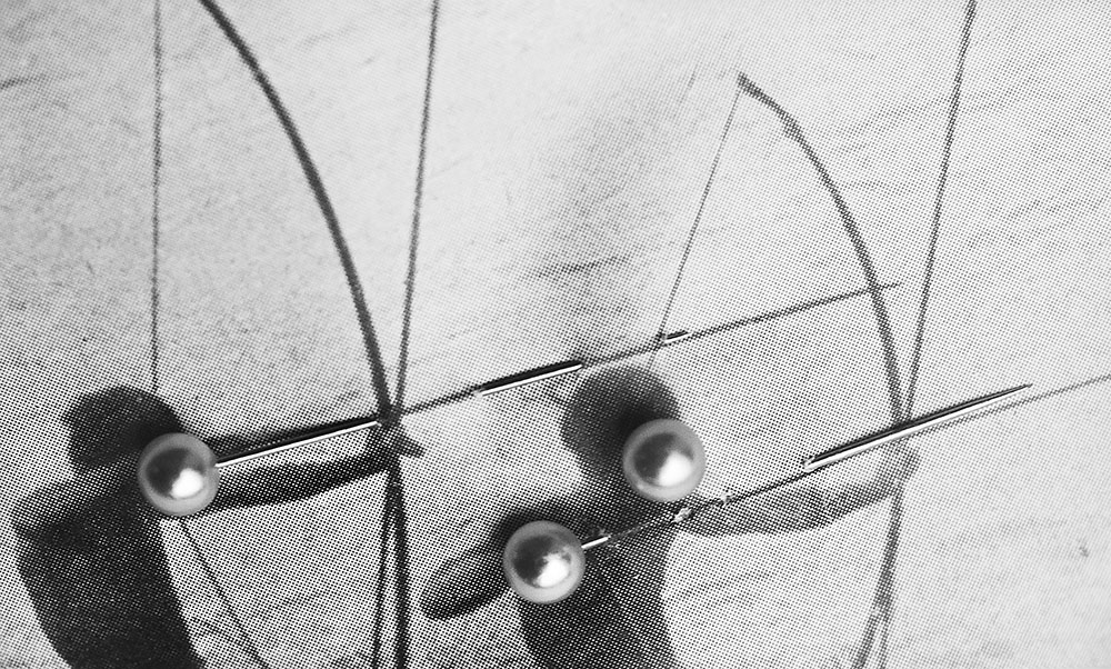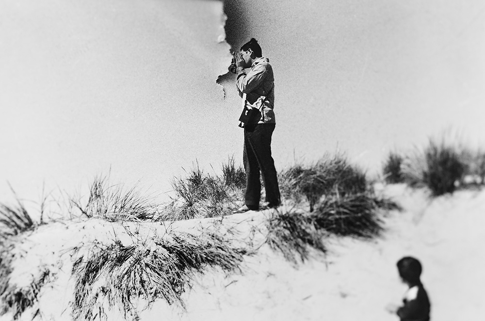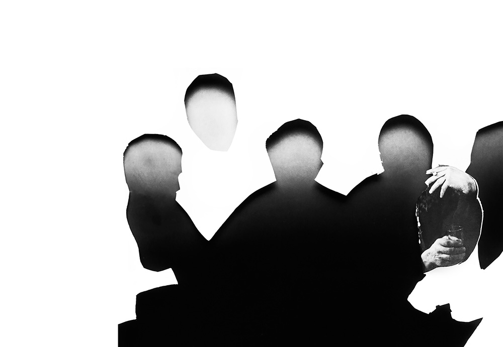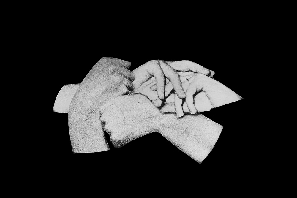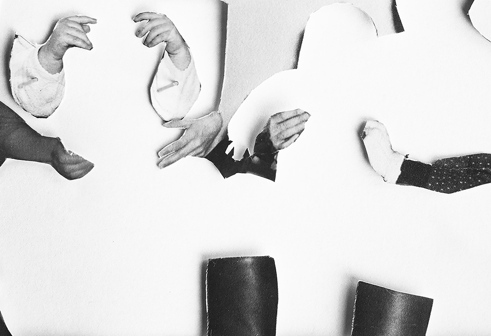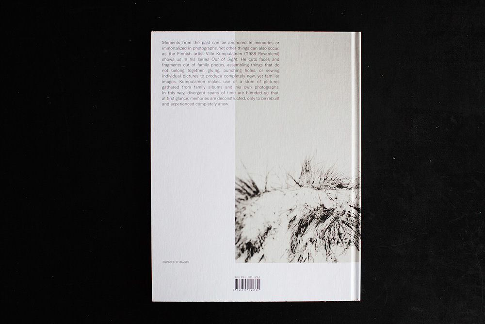 Something breaks through the surface, or is just about to burst out—a nameless shimmer. In the black-and-white collage photographs of Out of Sight, the layers of being and memory are intertwined. Fragments of objects and humans cut out from the photos, as if multiple temporalities coexisted within the same sentence.